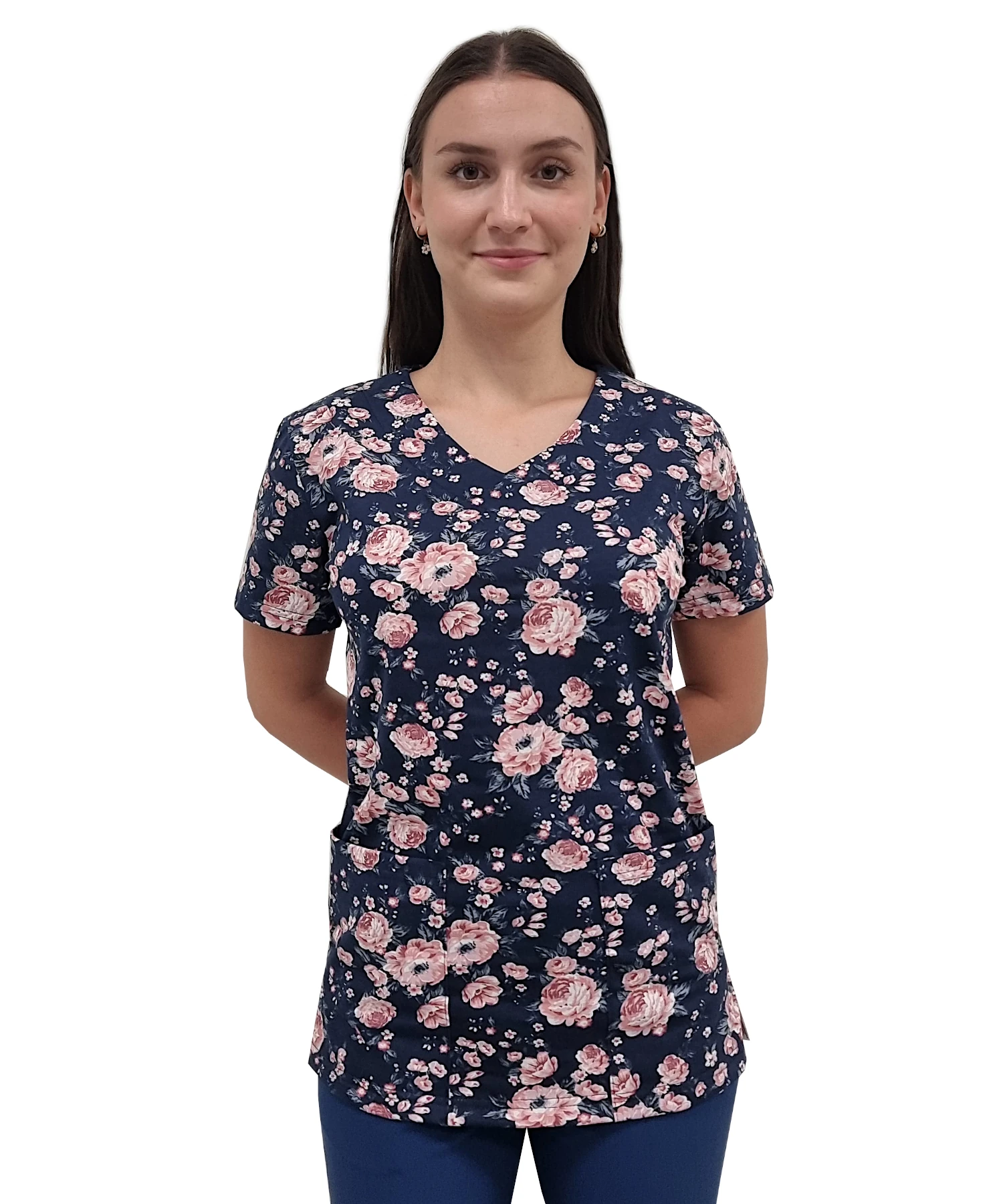 Blusa medica da donna con motivi della collezione ELASTIC BLOOM è un abbigliamento medico unico progettato per donne che vogliono combinare un aspetto professionale con un tocco di stile e colore. Realizzata in 100% cotone elastico, é traspirante, leggera e molto confortevole da indossare. Il modello W10 rende la blusa unica tra i modelli classici, portando gioia ed energia nel lavoro quotidiano.