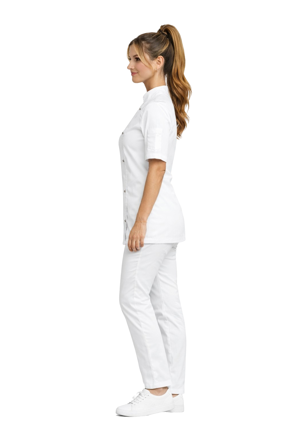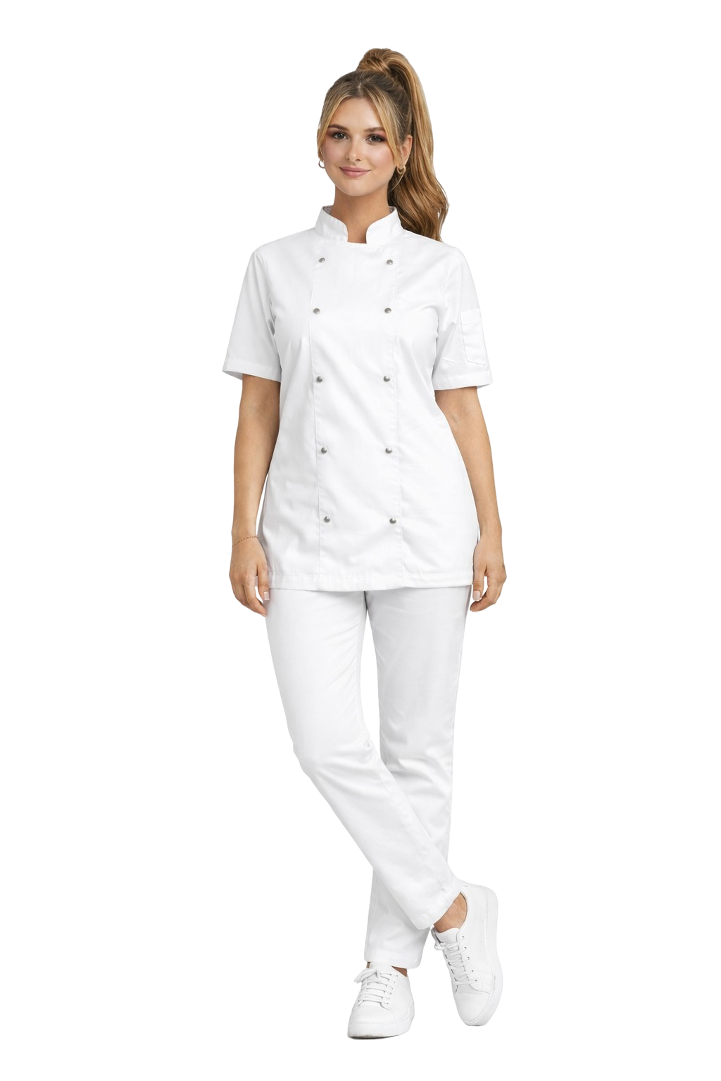 Set da cucina per donna composto da una giacca da cucina aderente con bottoni a pressione e comodi pantaloni da cuoco, è la soluzione ideale per le donne che lavorano nel settore della ristorazione. Il set combina un look professionale, la durata dei materiali e il comfort durante ore di lavoro.