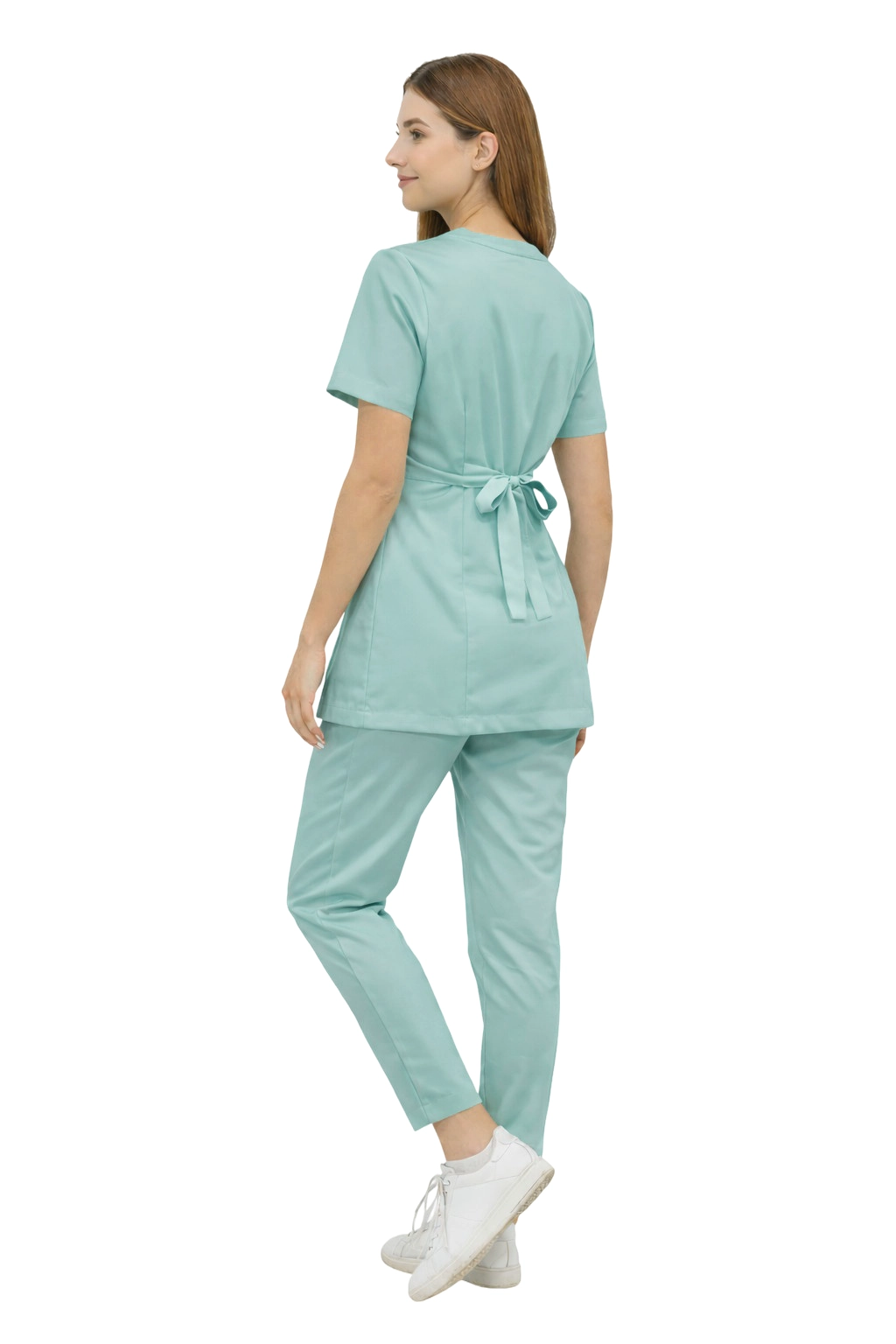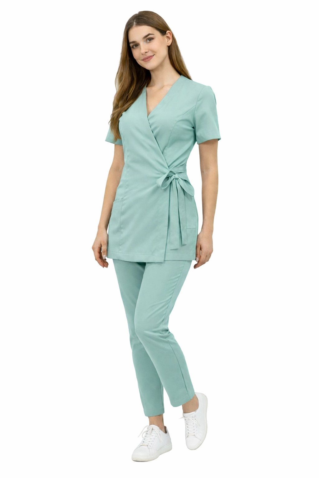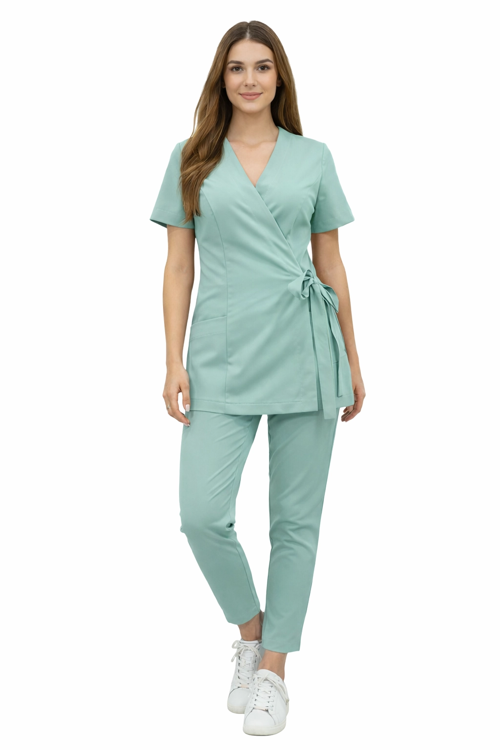 Il kit Basic Premium è una combinazione di eleganza, funzionalità e comfort - progettato per le donne che lavorano nel settore medico, cosmetico e wellness. È composto da una giacca a portafoglio (tunica) e da pantaloni Basic Premium, formando una uniforme medica coerente ed elegante.