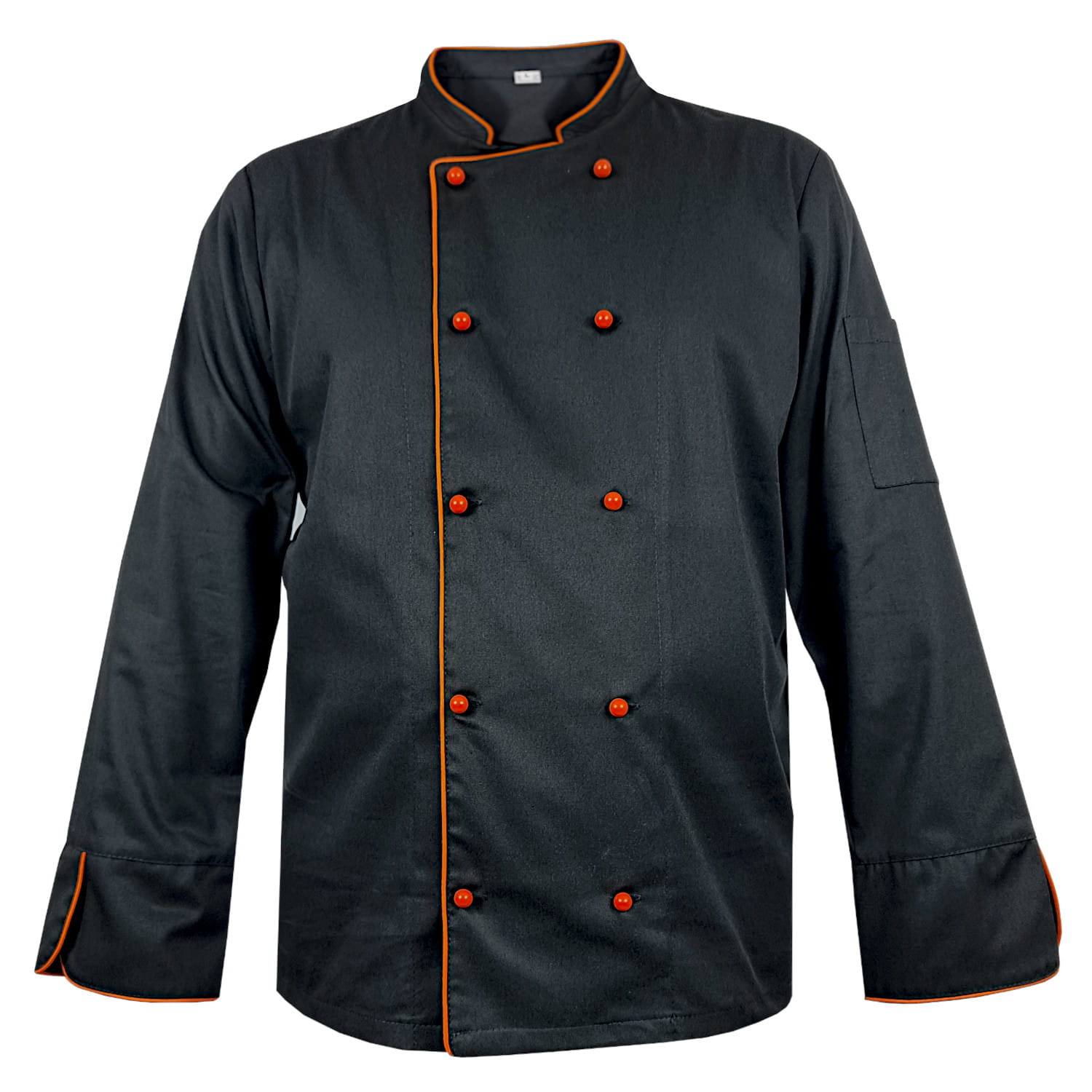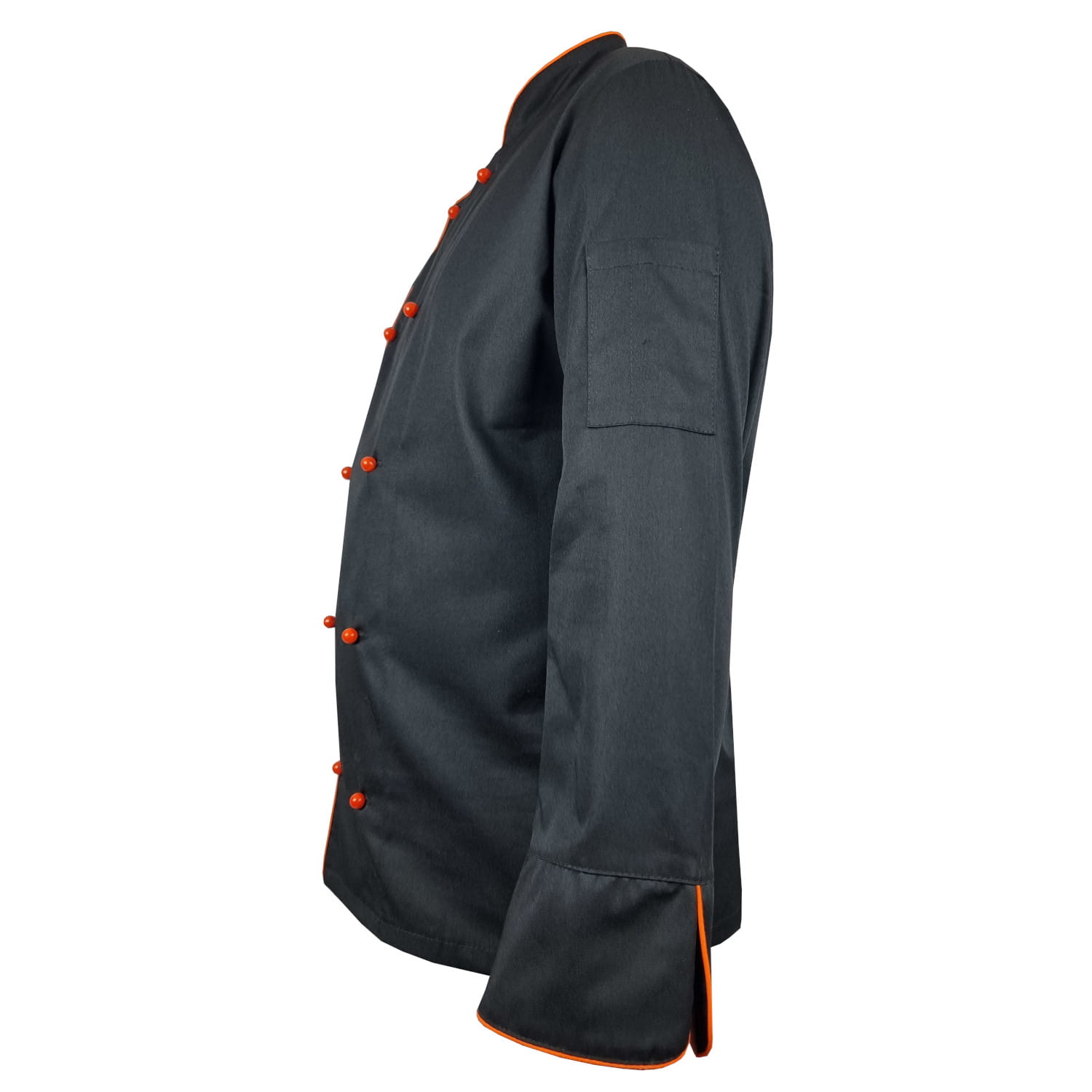 La giacca da cuoco nera con elementi arancioni si adatta perfettamente in molti luoghi legati al settore della ristorazione.