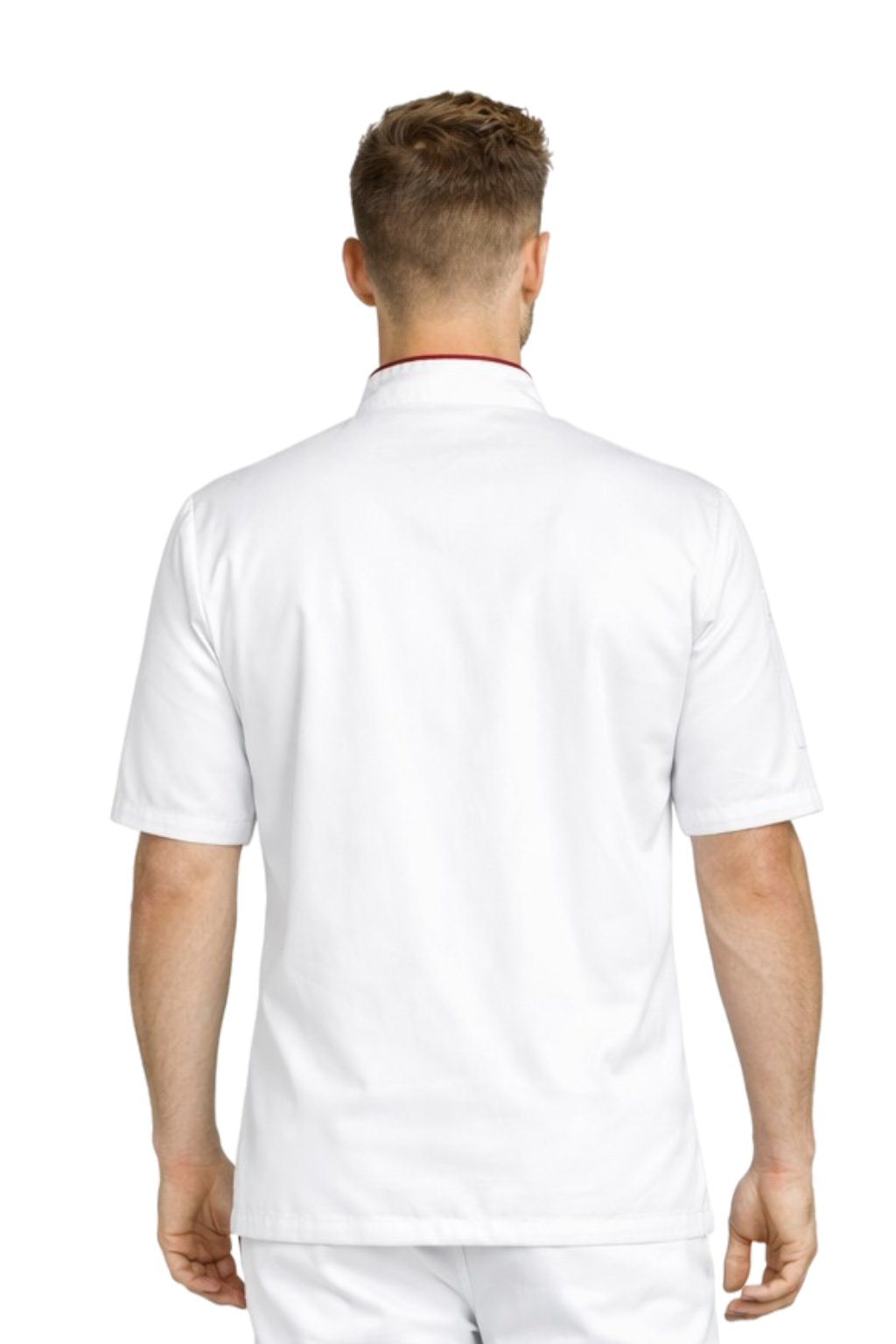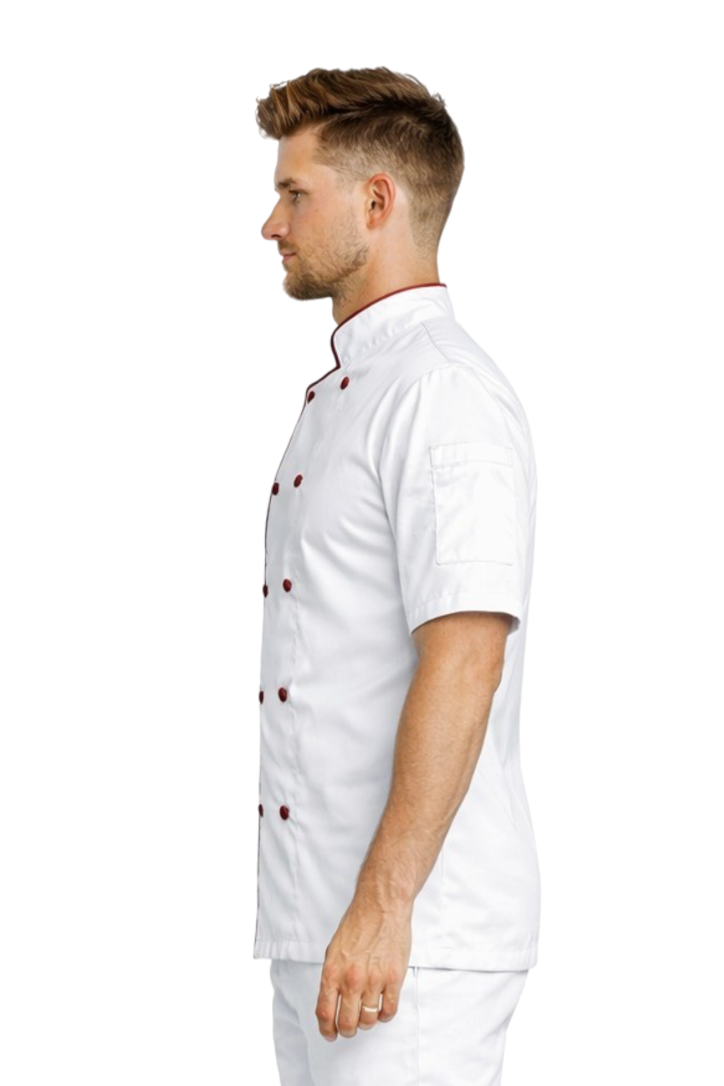 Giacca da cuoco bianca da uomo con bordatura bordeaux – grembiule gastronomico, manica corta