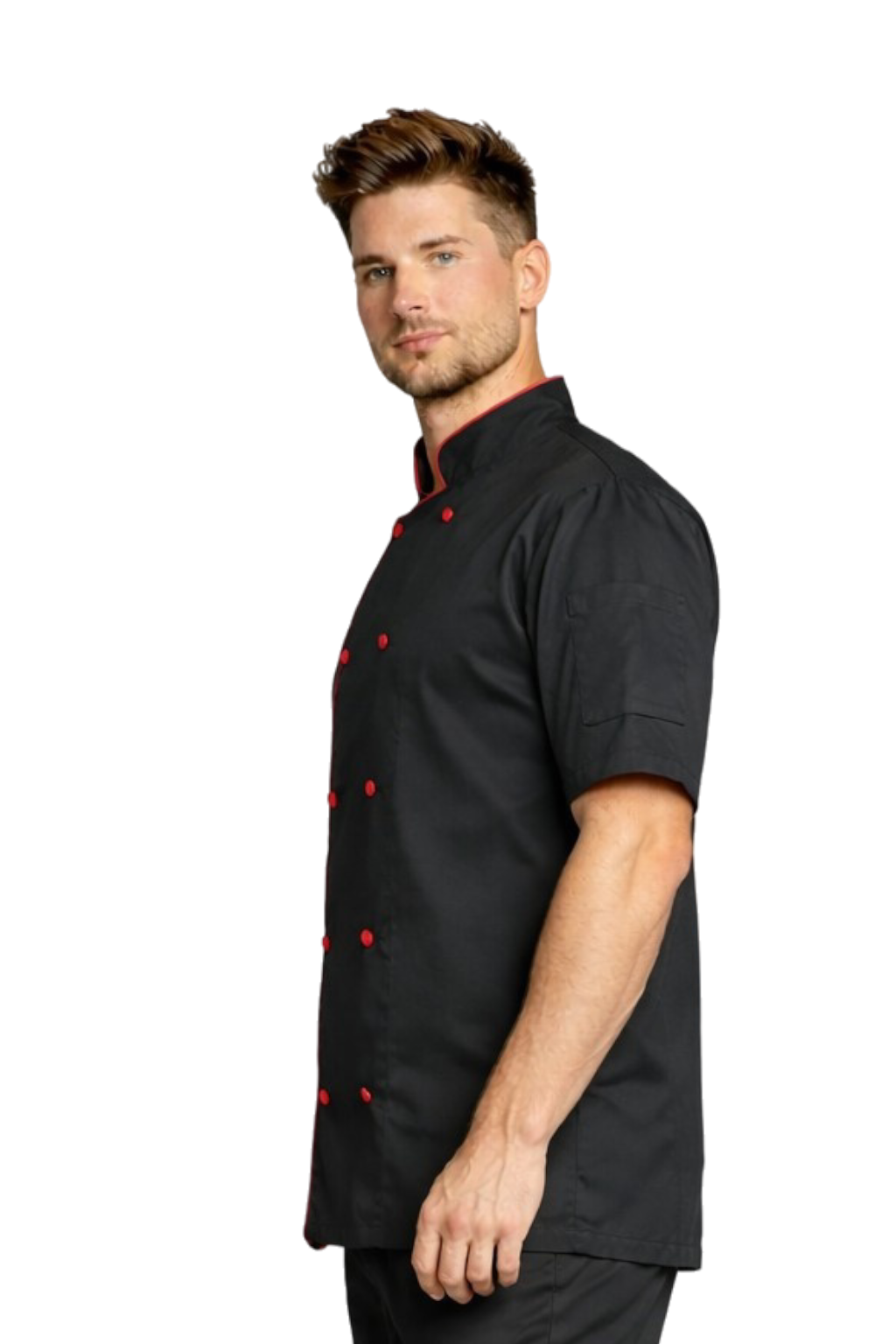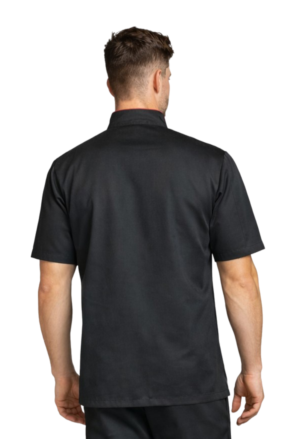 Giacca da cuoco nera da uomo con bordatura bordeaux – grembiule gastronomico, maniche corte