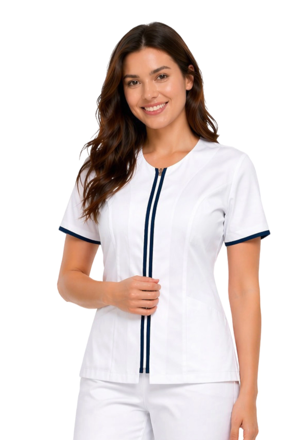 Giacca medica cosmetica bianca con rifinitura blu, chiusura a zip.