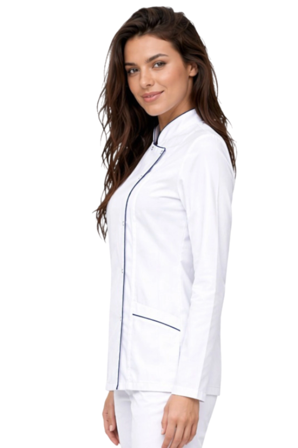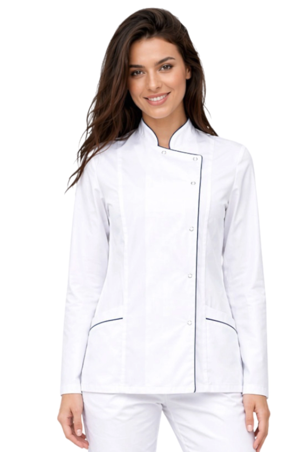 Giacca medica donna bianca con elegante profilo blu navy è un connubio di uniformi mediche classiche e design moderno. Il modello della serie COSMETIC è stato creato pensando alle donne che lavorano nel settore medico e della bellezza, che desiderano sentirsi professionali e allo stesso tempo stilose nel loro lavoro.
