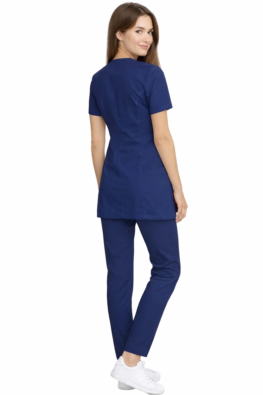 Il completo medico femminile CASUAL PREMIUM di colore blu marino è un'uniforme elegante, moderna e molto funzionale, progettata pensando alle donne che lavorano in un ambiente medico e cosmetico difficile. Il colore sobrio sottolinea la professionalità, mentre il taglio accurato garantisce comfort e libertà di movimento per tutto il giorno.