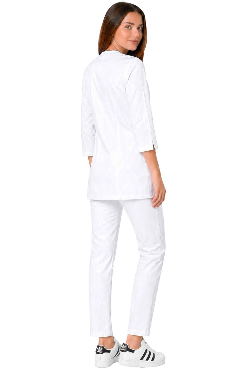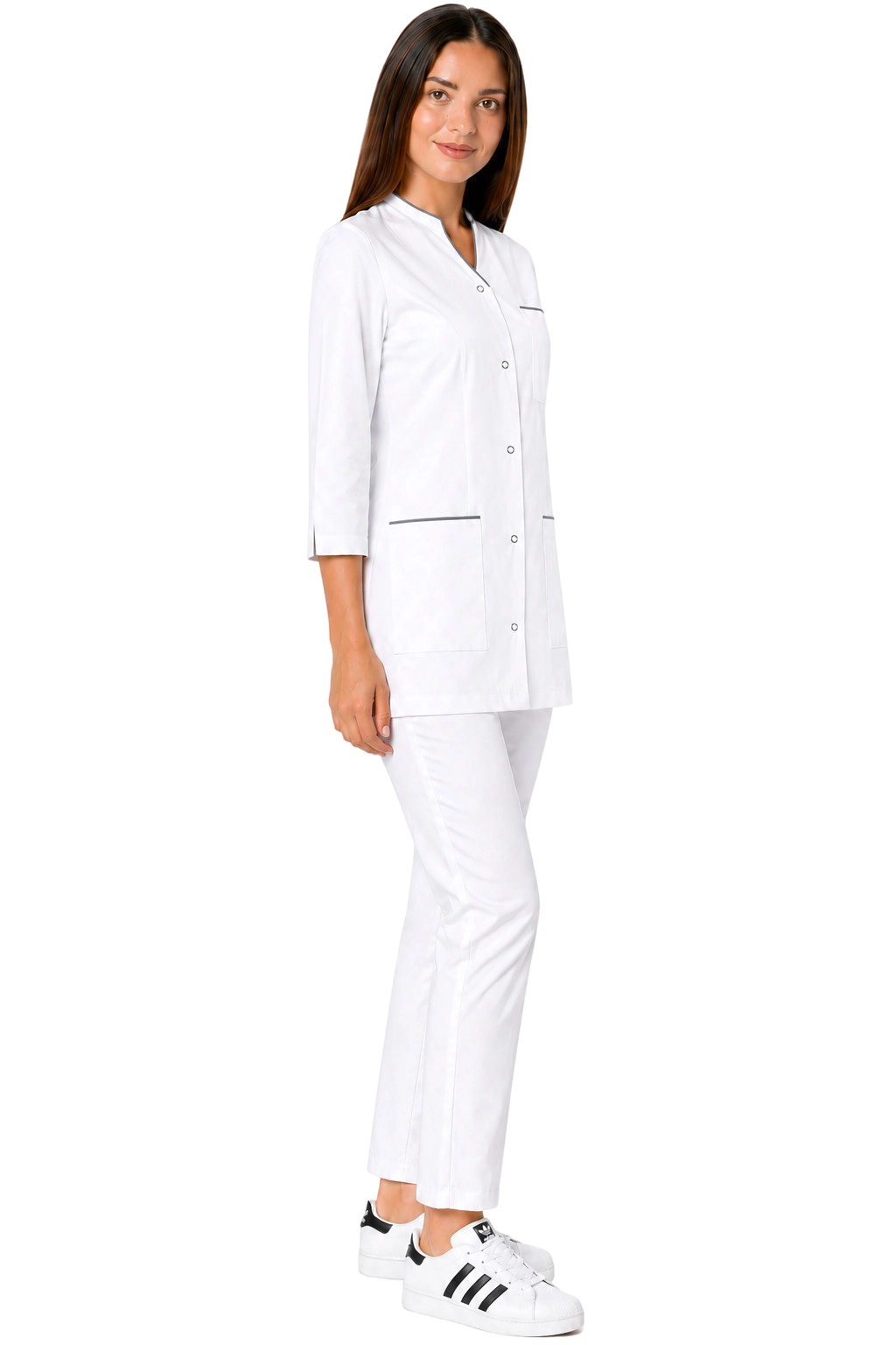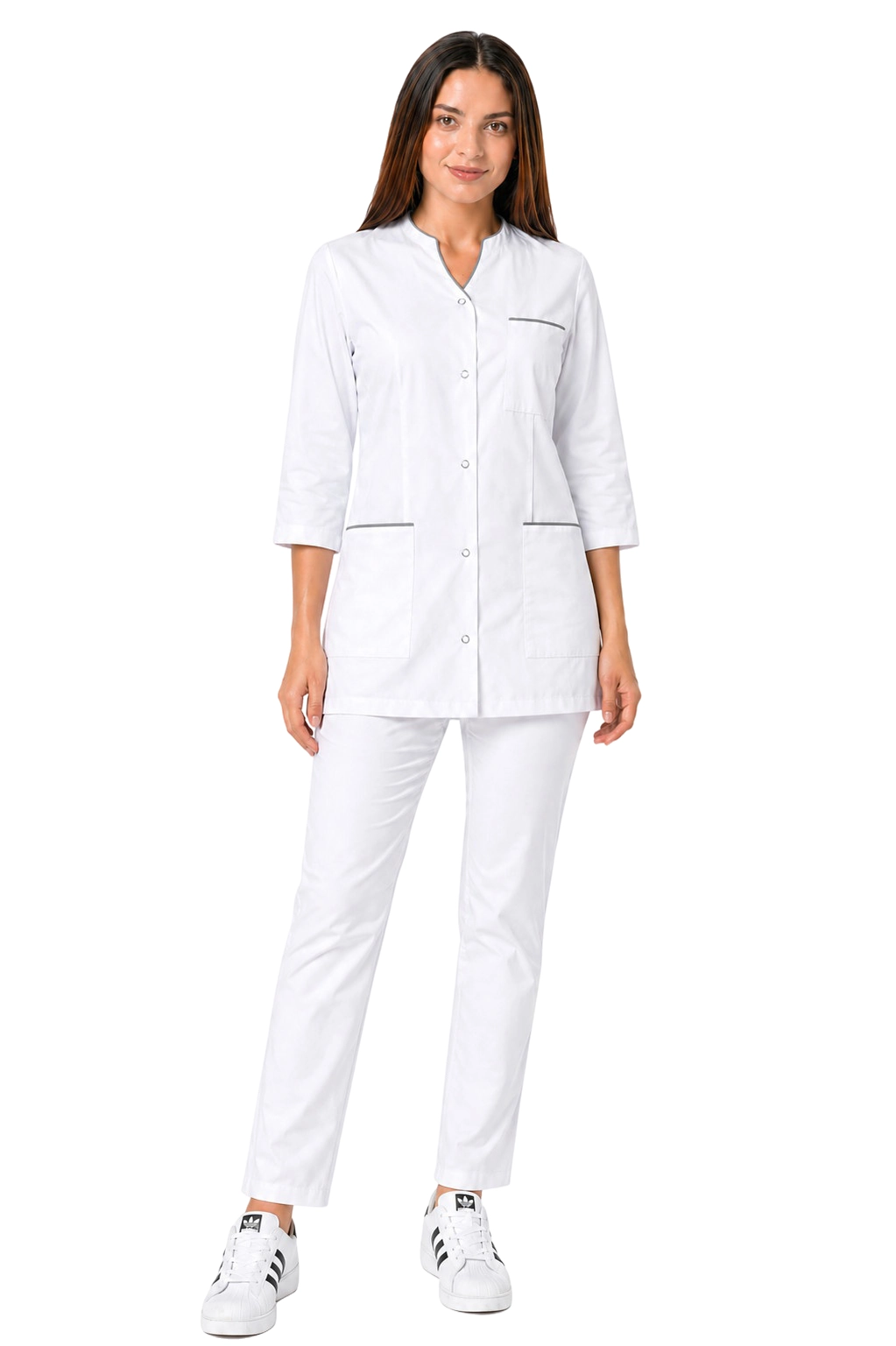 Completo medico da donna bianco - giacca da dottore 3/4 con bordatura grigia e pantaloni bianchi PHARMACY COMFORT è la scelta perfetta per le professioniste nel campo della medicina e della cosmetologia. Il nostro set unico combina eleganza e funzionalità, garantendo comfort durante il lavoro quotidiano. Giacca con chiusura frontale, con una rifinitura estetica, si abbina perfettamente a comodi pantaloni a sigaretta che mettono in evidenza la silhouette. Progettato pensando alle farmacie, farmacisti, ottici e personale di registrazione, la nostra uniforme si rivelerà utile anche per infermieri, estetiste e parrucchieri. Scegli un abito comodo ed elegante che ti aiuterà nelle sfide quotidiane!